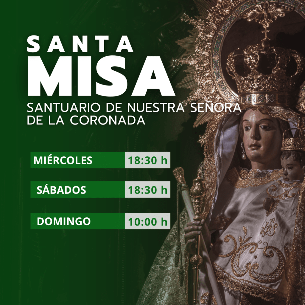 A partir del lunes 28 de octubre de 2024 entra en vigor el nuevo horario de las celebraciones de la Santa Misa en el Santuario de Nuestra Señora de la Coronada.
