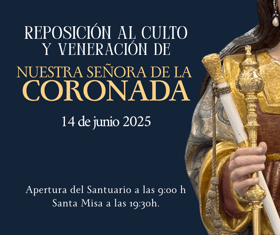 La Hermandad de Nuestra Señora de la Coronada anuncia que, el próximo sábado 14 de junio, la imagen de Nuestra Señora de la Coronada será repuesta al culto tras su proceso de restauración en el taller de don Pedro Manzano Beltrán, situado en la ciudad de Sevilla.
