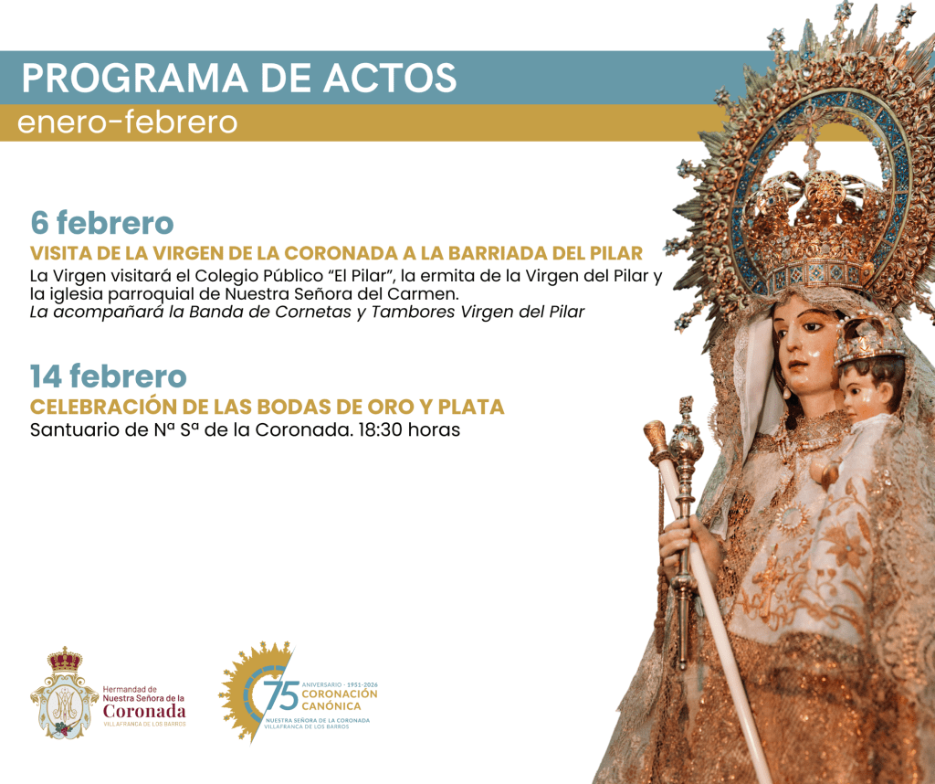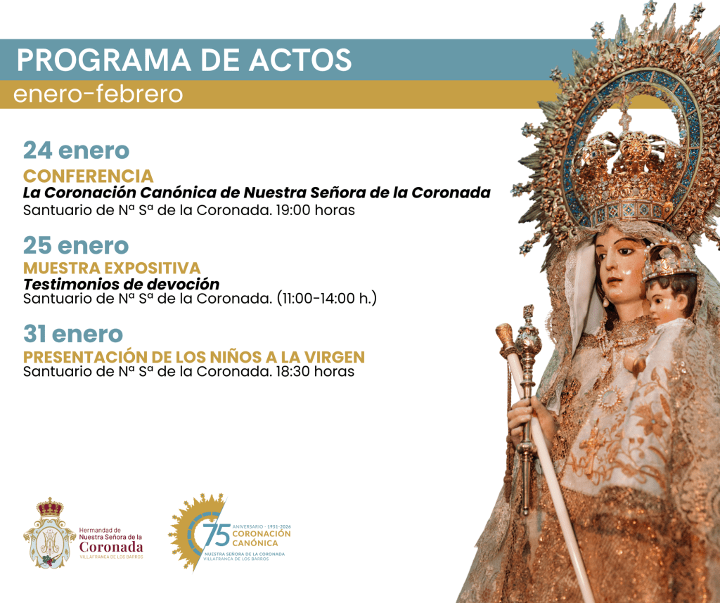Con el inicio del nuevo año, compartimos parte de la programación de actos organizados con motivo del 75º Aniversario de la Coronación Canónica de Nuestra Señora de la Coronada.