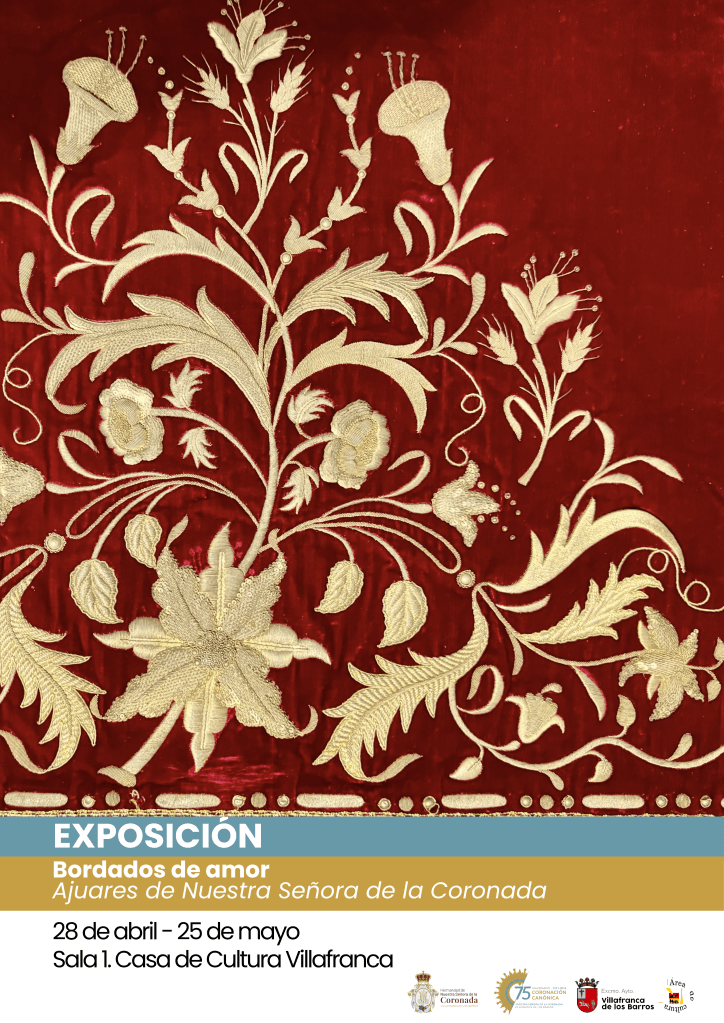 El martes 28 de abril a las 20:30 h se inaugurará en la Sala I de la Casa de Cultura villafranquesa la exposición “Bordados de Amor. Ajuares de Nuestra Señora de la Coronada”, mostrando al público las vestiduras y piezas textiles pensadas para enriquecer la magnífica talla renacentista de la Virgen Coronada y que forman parte del variado patrimonio artístico ligado a la Patrona de Villafranca de los Barros.